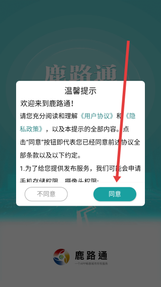 1、在打開鹿路通app后,在出現(xiàn)的彈窗中點(diǎn)擊同意按鈕后進(jìn)入。