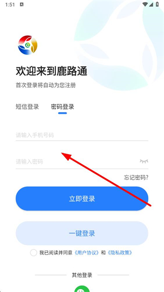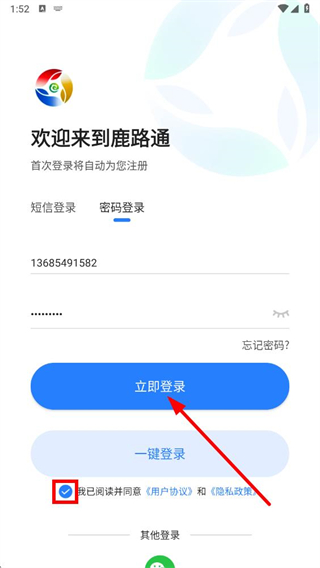 3、勾選已閱讀并同意用戶協(xié)議和隱私政策后,點(diǎn)擊立即登錄即可使用密碼登錄。