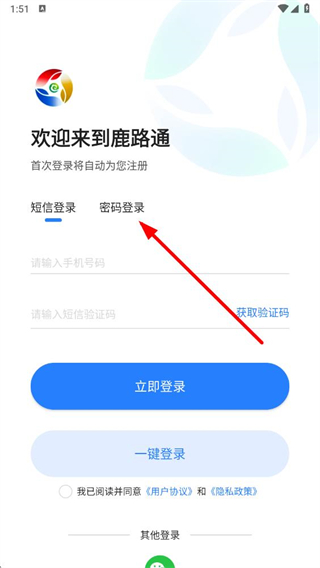 1、打開鹿路通APP,在登錄頁(yè)面點(diǎn)擊密碼登錄選項(xiàng)。
