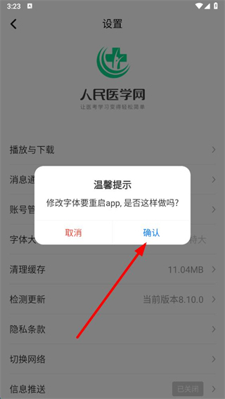 4、在彈出的溫馨提示框中,點(diǎn)擊確認(rèn)按鈕,重啟app后即可完成字體大小的修改。