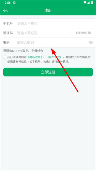 4、在注冊頁面輸入手機號、驗證碼和密碼,勾選同意相關(guān)協(xié)議后點擊“立即注冊”按鈕,完成注冊操作。