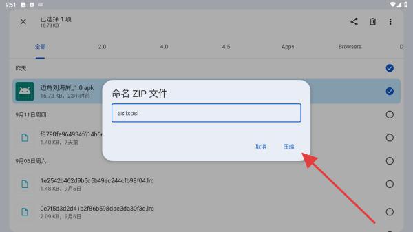 4、在彈出的輸入框中,輸入ZIP文件,再點擊壓縮的按鈕即可。