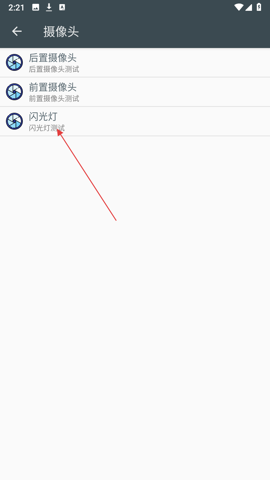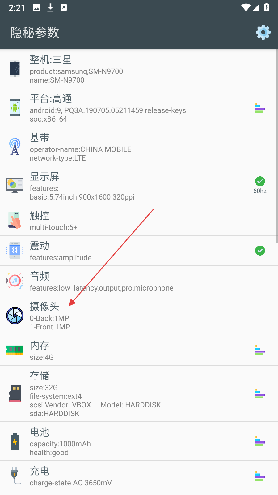 1、打開隱秘參數(shù)應(yīng)用,在隱秘參數(shù)頁面中找到攝像頭選項,點擊進入攝像頭測試頁面。