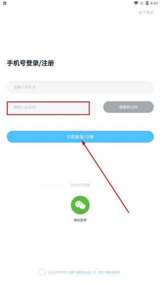 4、輸入收到的驗證碼,點擊立即登錄/注冊,即可完成登錄。