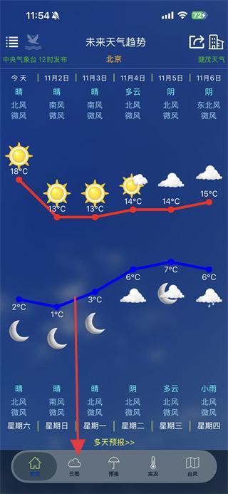 支持一周內(nèi)氣溫趨勢圖、實(shí)況溫度計(jì)動畫顯示以及風(fēng)向風(fēng)力盤圖等。