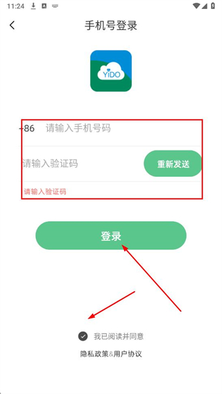 2、進(jìn)輸入手機(jī)號碼,點(diǎn)和接收到的驗(yàn)證碼,勾選隱私政策和用戶協(xié)議。點(diǎn)擊登錄按鈕。