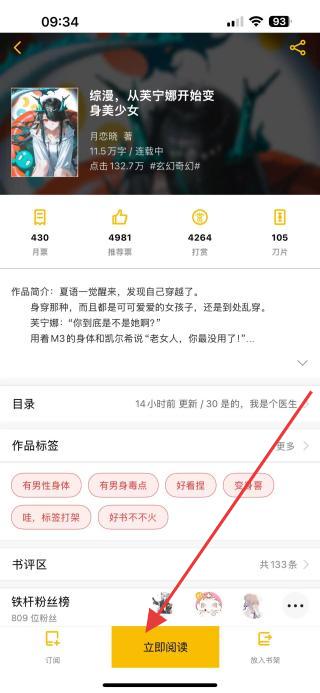 3、點擊目標(biāo)作品進入詳情頁,點擊立即閱讀按鈕,即可免費閱讀該小說。