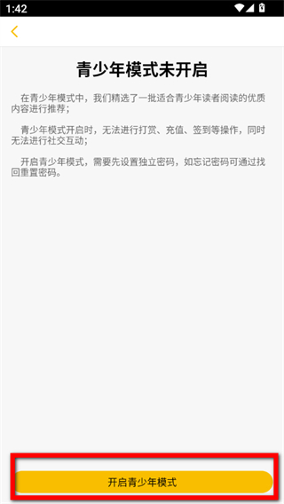 4、在青少年模式說明頁面,點擊開啟青少年模式按鈕,按提示完成青少年模式開啟操作。