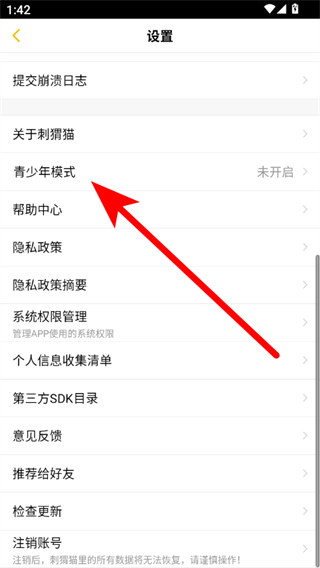 3、在設(shè)置頁面,點擊青少年模式選項,進入青少年模式說明頁面。