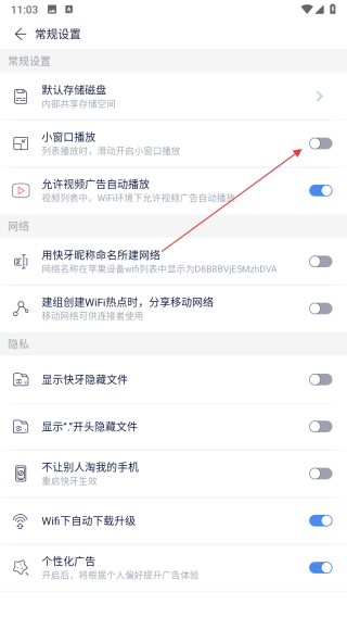 4、在常規(guī)設(shè)置頁面,找到小窗口播放功能對應(yīng)的開關(guān)按鈕,點擊該開關(guān)將其開啟。