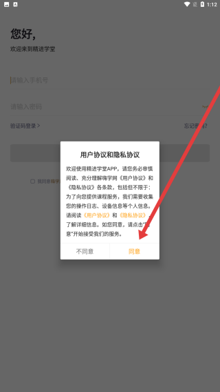 2、在用戶協(xié)議和隱私政策彈窗中點擊同意進入登錄界面,開啟賬號登錄流程。