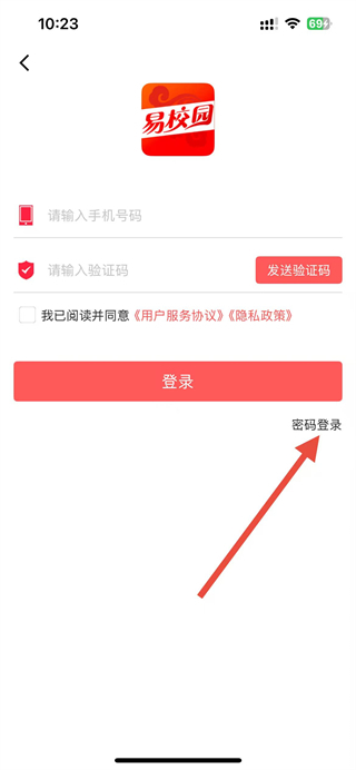 1、打開易校園后,勾選同意用戶協(xié)議,點(diǎn)擊下方其他登入方式里的手機(jī)圖標(biāo)。