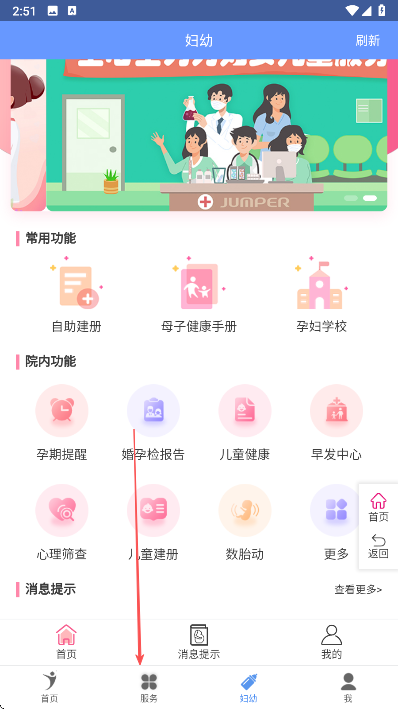 1、打開健康義烏APP,進(jìn)入首頁,點擊底部菜單欄中的服務(wù)選項,進(jìn)入服務(wù)頁面。