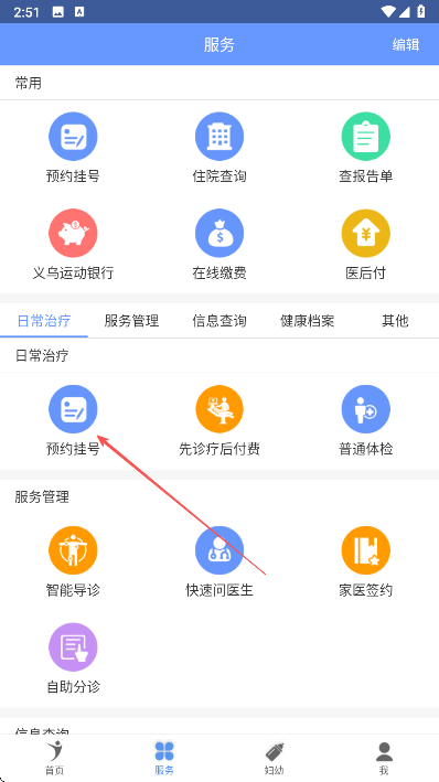 2、在服務(wù)頁面的日常治療板塊中,找到并點擊預(yù)約掛號按鈕,進(jìn)入預(yù)約掛號界面。
