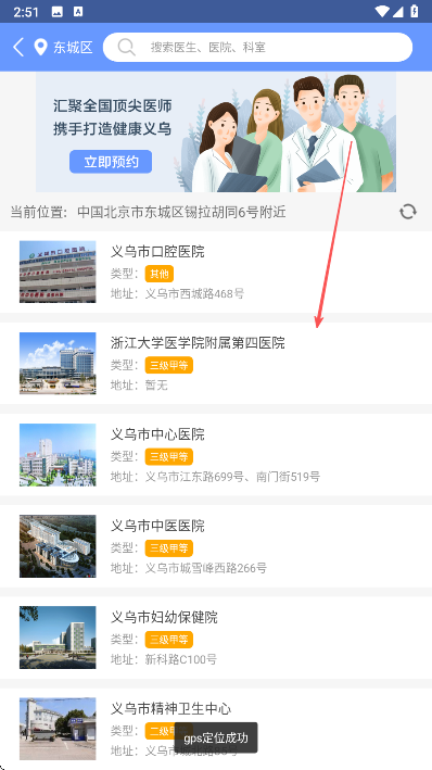 3、在預(yù)約掛號界面,系統(tǒng)會自動定位,查看附近醫(yī)院列表,選擇想要掛號的醫(yī)院,點擊進(jìn)入該醫(yī)院的掛號頁面。