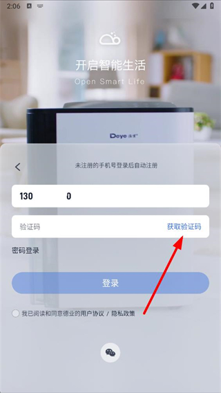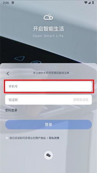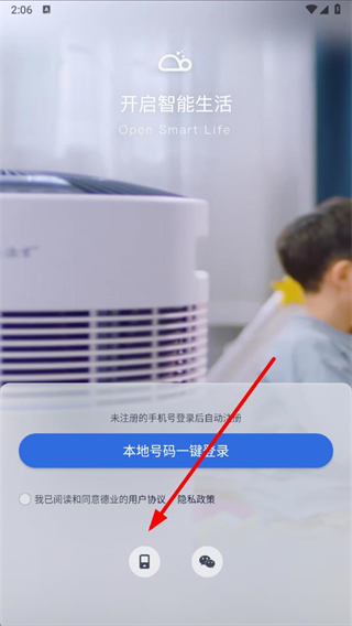 1、打開(kāi)德業(yè)智能app,在登錄頁(yè)面點(diǎn)擊手機(jī)圖標(biāo),進(jìn)入手機(jī)號(hào)登錄頁(yè)面。