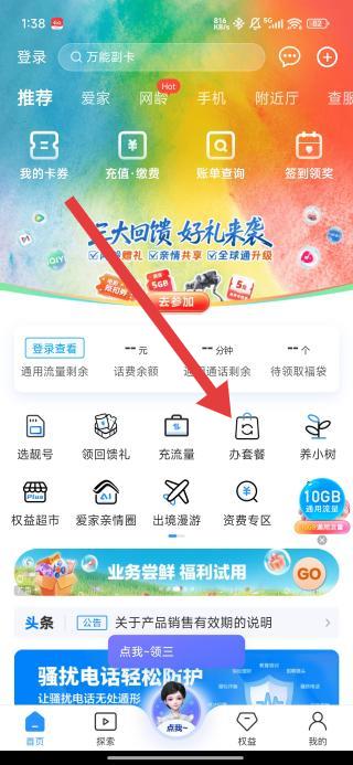 1、在中國(guó)移動(dòng)山東APP主界面,可以通過(guò)箭頭的指示點(diǎn)擊辦套餐圖標(biāo),進(jìn)入套餐分類(lèi)選擇頁(yè)面。