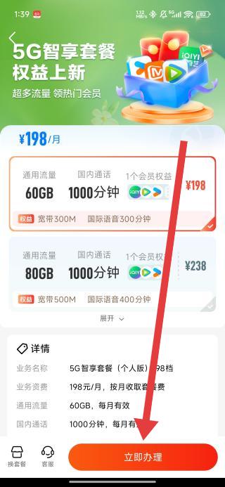 3、進(jìn)入到5G智享套餐詳情頁(yè)后,根據(jù)箭頭指示方向點(diǎn)擊底部紅色立即辦理按鈕,啟動(dòng)該套餐的辦理流程。