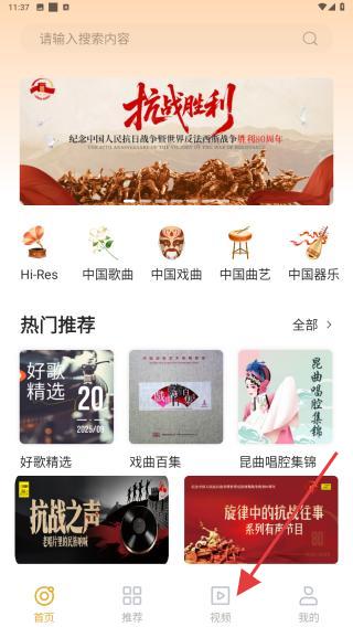 1、打開(kāi)中國(guó)音樂(lè)APP,在首頁(yè)內(nèi)點(diǎn)擊下方導(dǎo)航欄中視頻的圖標(biāo)。