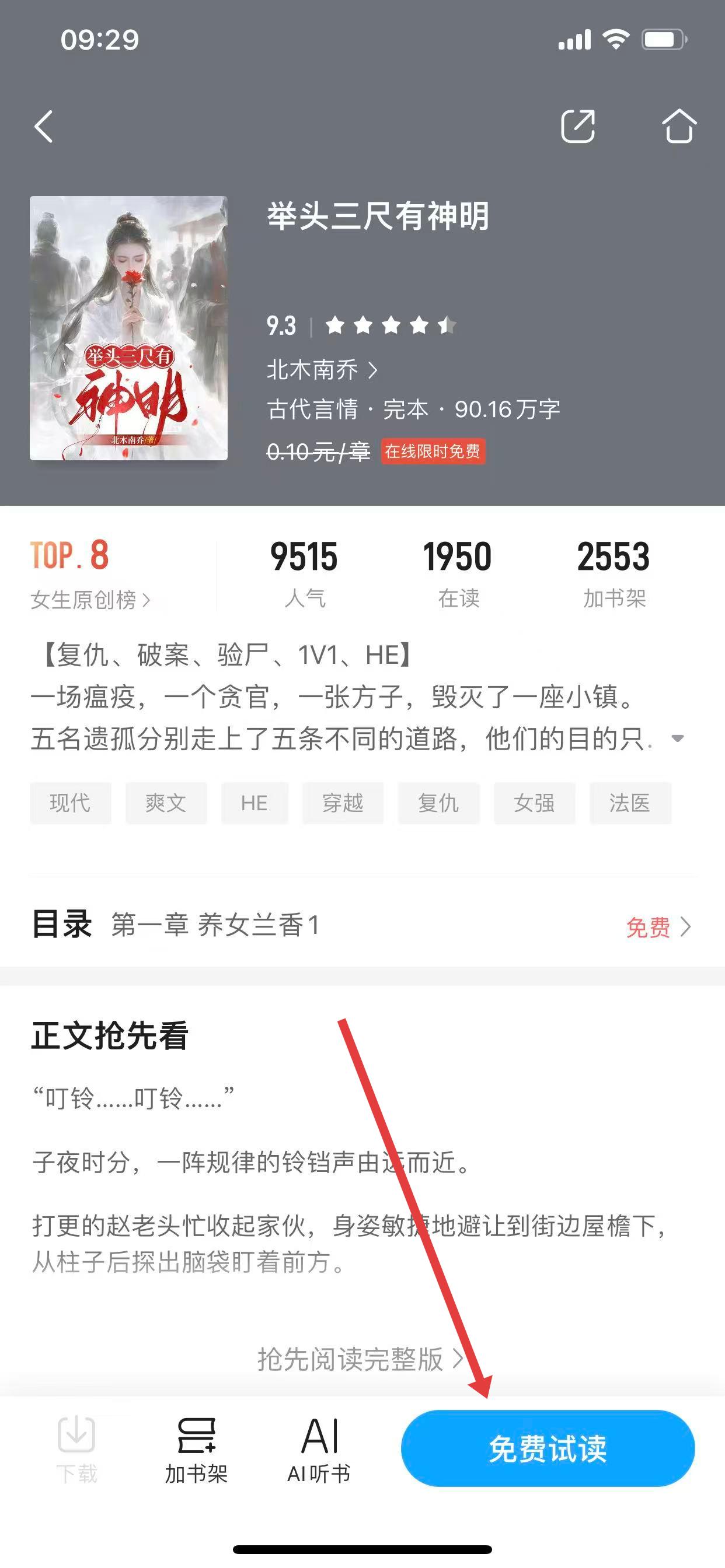 2、進入書籍詳情頁后,點擊免費試讀按鈕,進入閱讀界面。