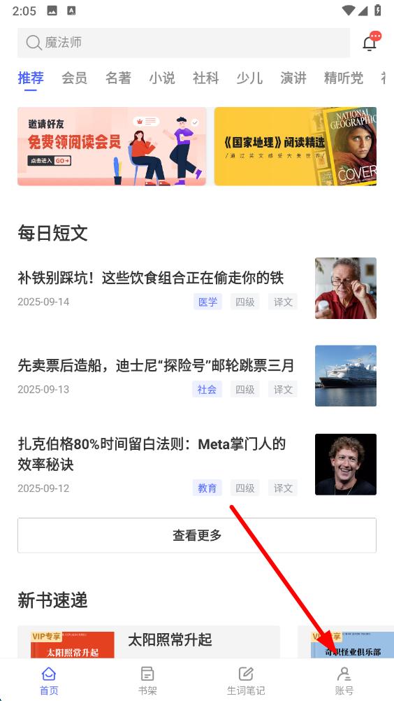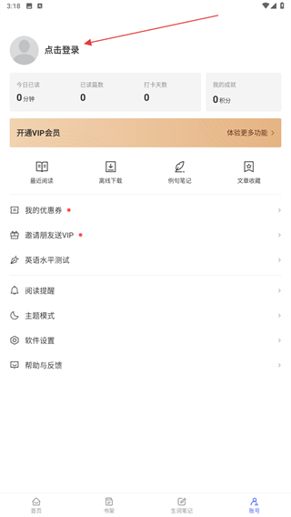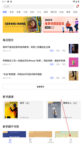 1、打開(kāi)每日英語(yǔ)閱讀app,點(diǎn)擊底部導(dǎo)航欄最右側(cè)的賬號(hào)圖標(biāo),進(jìn)入個(gè)人相關(guān)界面。