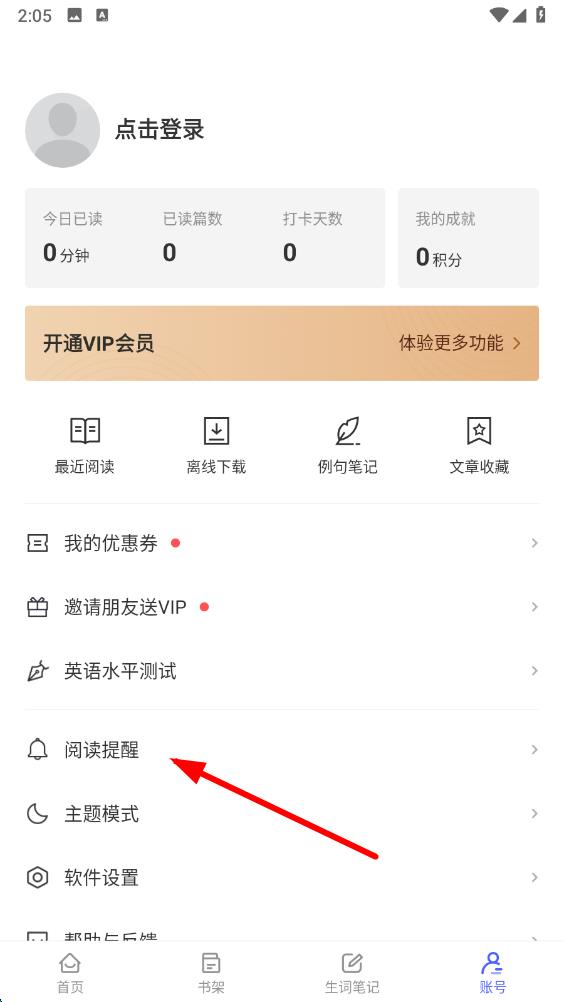 2、在個(gè)人界面中,找到并點(diǎn)擊閱讀提醒選項(xiàng),進(jìn)入閱讀提醒設(shè)置頁(yè)面。