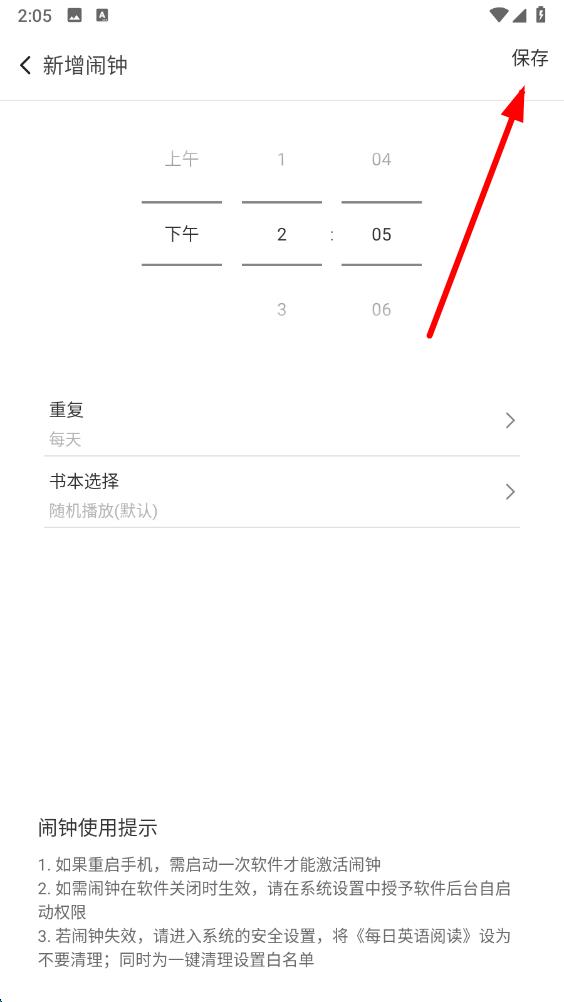 4、在新增鬧鐘頁(yè)面,設(shè)置好提醒時(shí)間,選擇提醒重復(fù)的頻率,完成后點(diǎn)擊右上角的保存,即可成功設(shè)置閱讀提醒功能。
