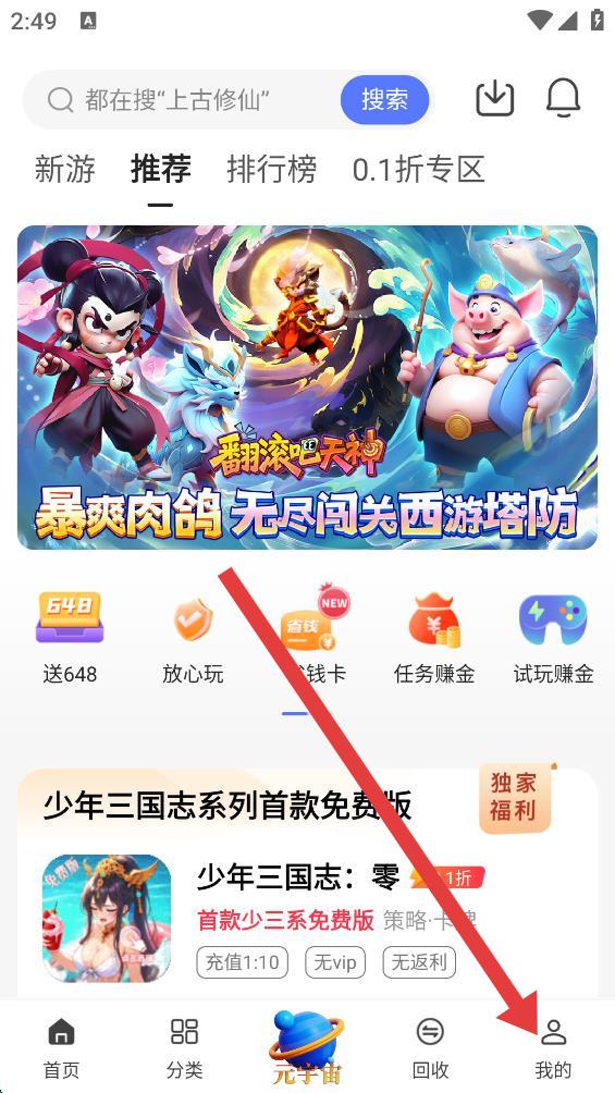 1、進入游戲盒子后,在首頁的位置可以看到許多熱門的游戲資源,點擊下方的【回收】功能;
