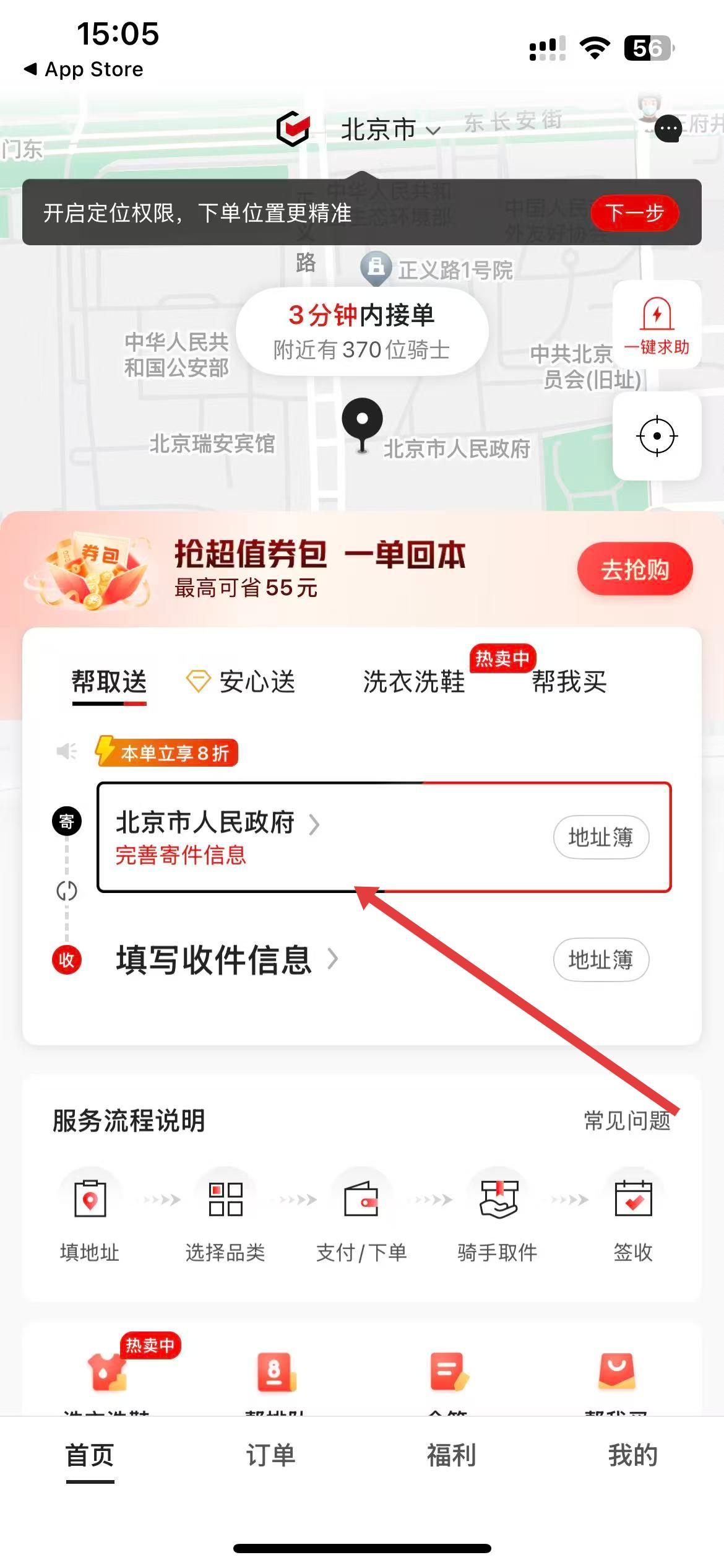 1、打開順豐同城app,在首頁確認(rèn)所在城市,選擇幫取送等服務(wù)類型后,點(diǎn)擊完善寄件信息,填寫寄件人和收件人相關(guān)信息。