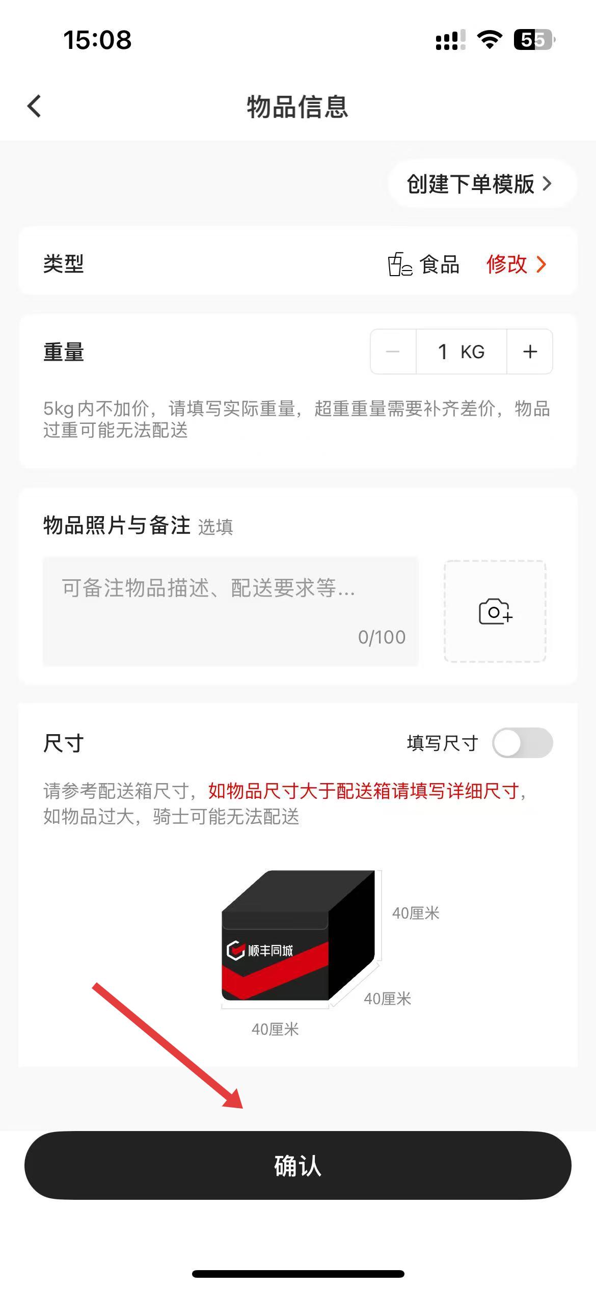 2、進(jìn)入物品信息頁面,選擇或修改物品類型,準(zhǔn)確填寫物品重量,還可以按需填寫物品尺寸,確認(rèn)信息無誤后,點(diǎn)擊確認(rèn)按鈕。
