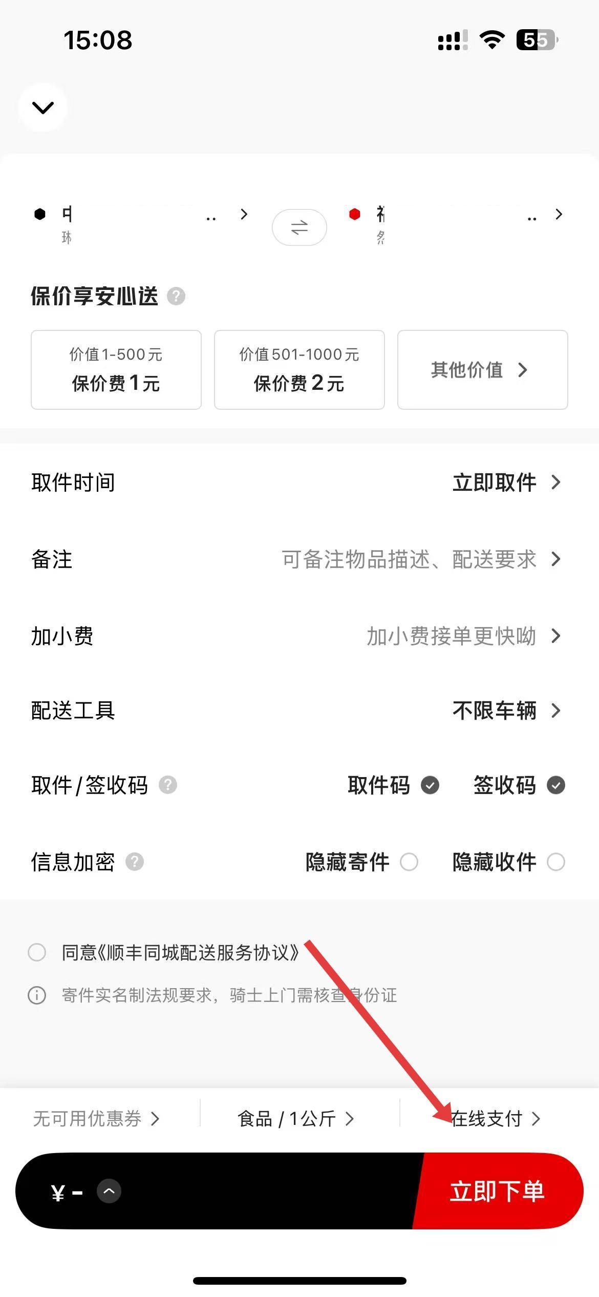 3、在訂單確認(rèn)頁面,核對寄件和收件信息,選擇保價(jià)、取件時(shí)間等增值服務(wù)及相關(guān)選項(xiàng),選擇在線支付方式,最后點(diǎn)擊立即下單。