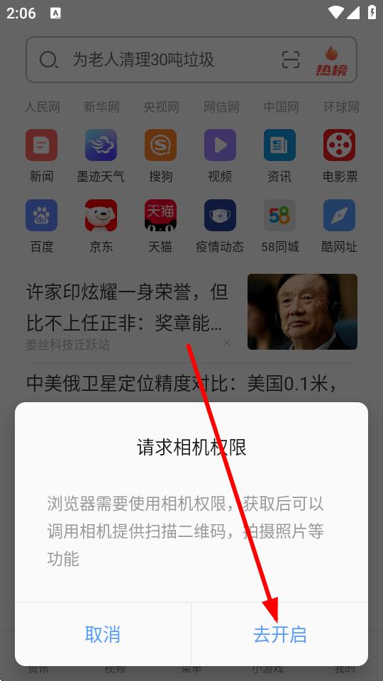 3、如果瀏覽器未獲取相機(jī)權(quán)限,會(huì)彈出請(qǐng)求相機(jī)權(quán)限的提示框,點(diǎn)擊去開(kāi)啟并按指引授予相機(jī)權(quán)限。