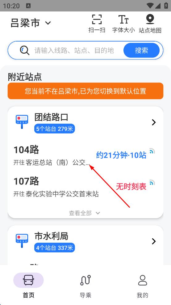 3、切換城市后,在附近站點(diǎn)列表中,找到并點(diǎn)擊要查看的公交線路,如104路。