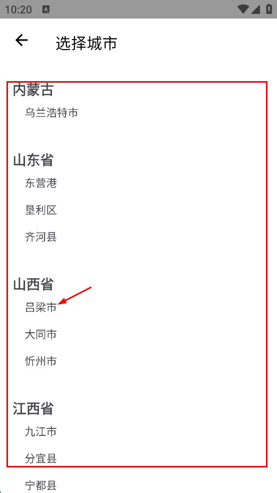 2、在選擇城市頁面,從列出的城市列表里,找到并點(diǎn)擊想要切換的城市,如呂梁市。