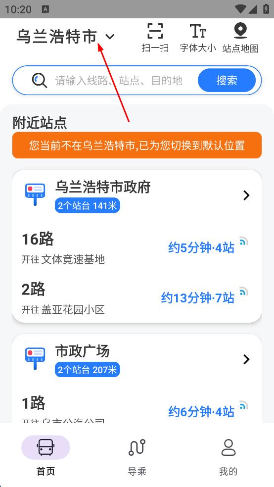 1、打開公交查詢軟件,點(diǎn)擊頁面頂部顯示的城市名稱旁的下拉箭頭,進(jìn)入選擇城市頁面。