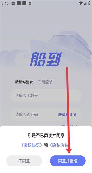 1、打開船到APP,點擊同意并繼續(xù)按鈕,確認授權(quán)協(xié)議和隱私協(xié)議,進入登錄界面。