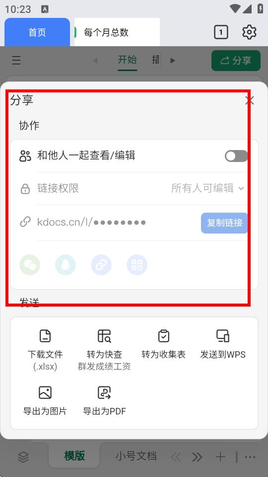 4、在彈出的分享設置界面中,開啟和他人一起查看/編輯開關(guān),并設置鏈接權(quán)限,然后點擊復制鏈接,將鏈接發(fā)送給需要分享的對象即可。