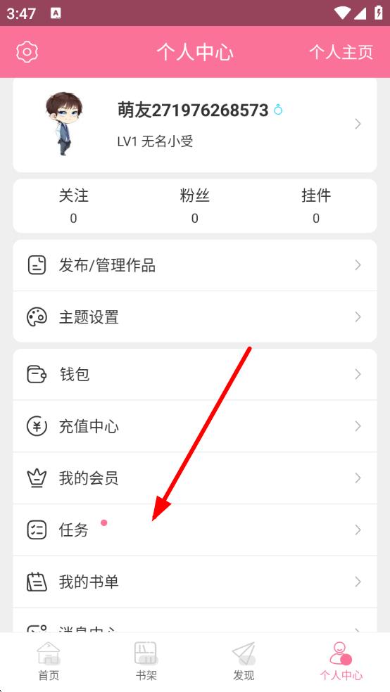 2、在個人中心頁面中,找到并點擊任務選項,進入任務界面。