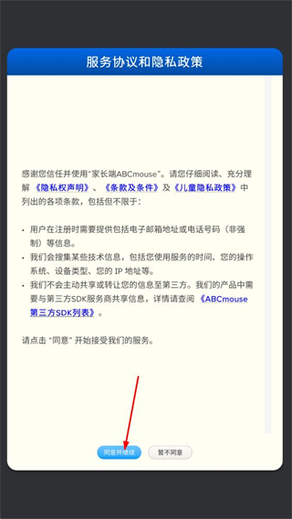 1、打開ABCmouse,在彈出的提示框中點擊同意并繼續(xù)。