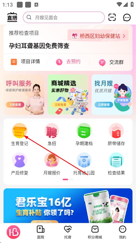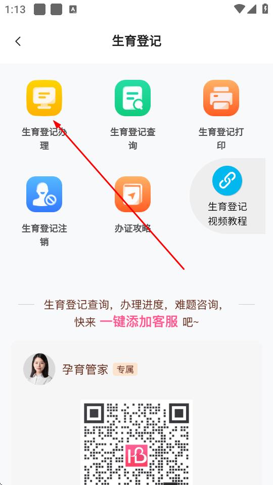 1、打開孕健康A(chǔ)PP,在首頁找到生育登記圖標(biāo),點(diǎn)擊進(jìn)入。