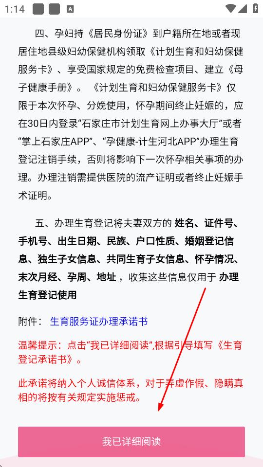 4、仔細(xì)閱讀辦理生育登記的相關(guān)說明及要求,點(diǎn)擊我已詳細(xì)閱讀按鈕。