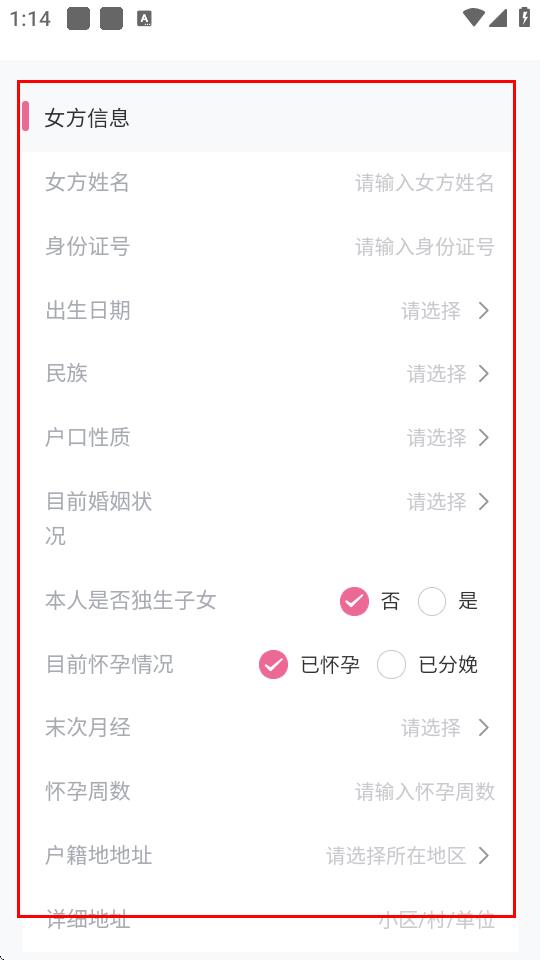 5、進(jìn)入信息填寫頁面,填寫女方信息、男方信息以及其他相關(guān)信息,等待審核即可。