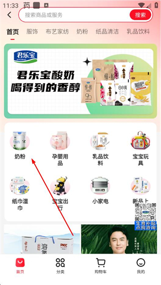 2、在商城頁面點(diǎn)擊奶粉分類選項(xiàng),進(jìn)入奶粉商品列表頁面。