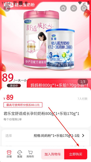 4、在商品詳情頁面點(diǎn)擊立即購買,完成下單支付流程,即可購買奶粉。