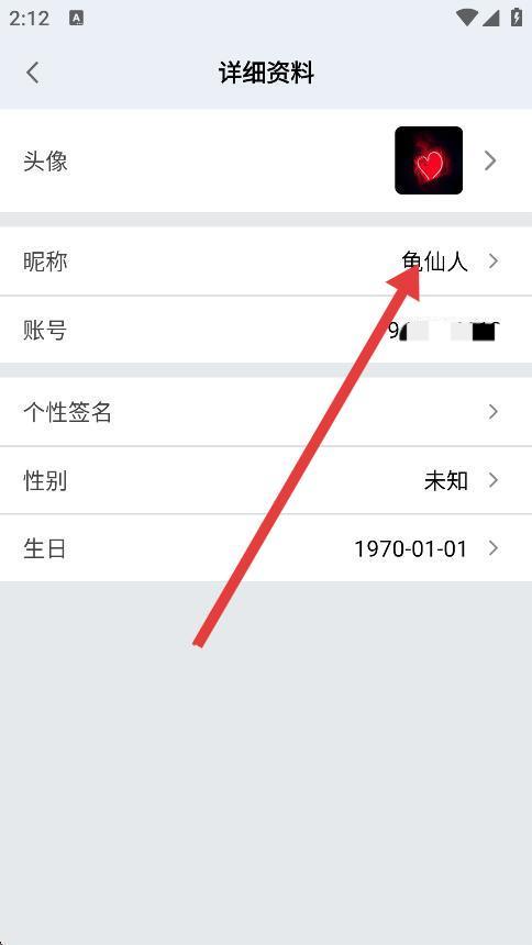 3、在詳細(xì)資料頁面里,點(diǎn)擊昵稱右側(cè)的箭頭。