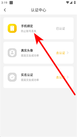 3、進(jìn)入認(rèn)證中心頁(yè)面后,點(diǎn)擊手機(jī)綁定選項(xiàng)。