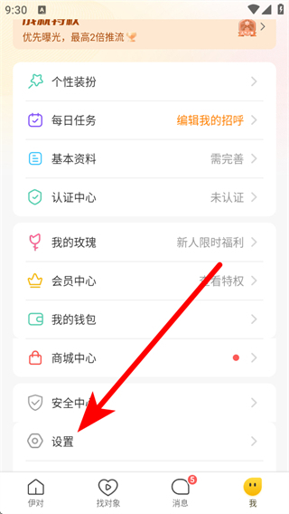 1、打開伊對(duì)APP,點(diǎn)擊右下角我,進(jìn)入個(gè)人頁(yè)面后點(diǎn)擊設(shè)置選項(xiàng)。