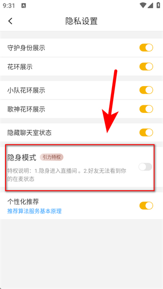4、點(diǎn)擊隱身模式右側(cè)的開關(guān)按鈕,將其開啟即可。