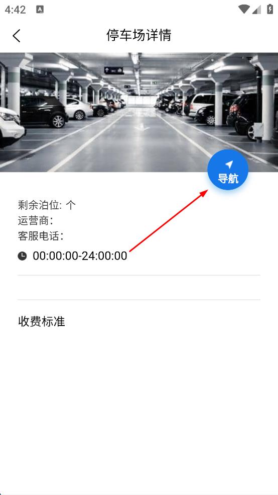 3、點(diǎn)擊進(jìn)入停車場詳情頁,查看剩余泊位、運(yùn)營時(shí)間等內(nèi)容,點(diǎn)擊導(dǎo)航按鈕,按指引前往停車場 。