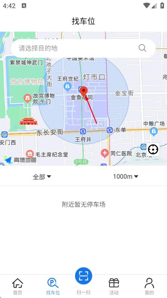 2、在找車位頁面的搜索框輸入目的地,地圖將定位目標(biāo)區(qū)域,若附近有停車場會顯示相關(guān)信息。